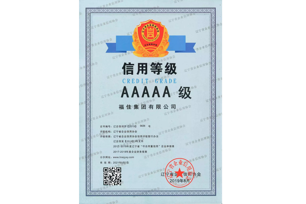 2019年12月12日,福佳集團(tuán)有限公司收到由遼寧省企業(yè)信用協(xié)會(huì)頒發(fā)的“守合同重信用”企業(yè)公示證書,被認(rèn)定為2017-2018年度遼寧省 “守合同重信用”企業(yè)。經(jīng)遼寧省企業(yè)信用協(xié)會(huì)評(píng)定,福佳集團(tuán)信用等級(jí)AAAAA級(jí)。這是對(duì)福佳集團(tuán)長(zhǎng)期秉持“誠(chéng)信發(fā)展 服務(wù)社會(huì)”經(jīng)營(yíng)理念的最好詮釋。