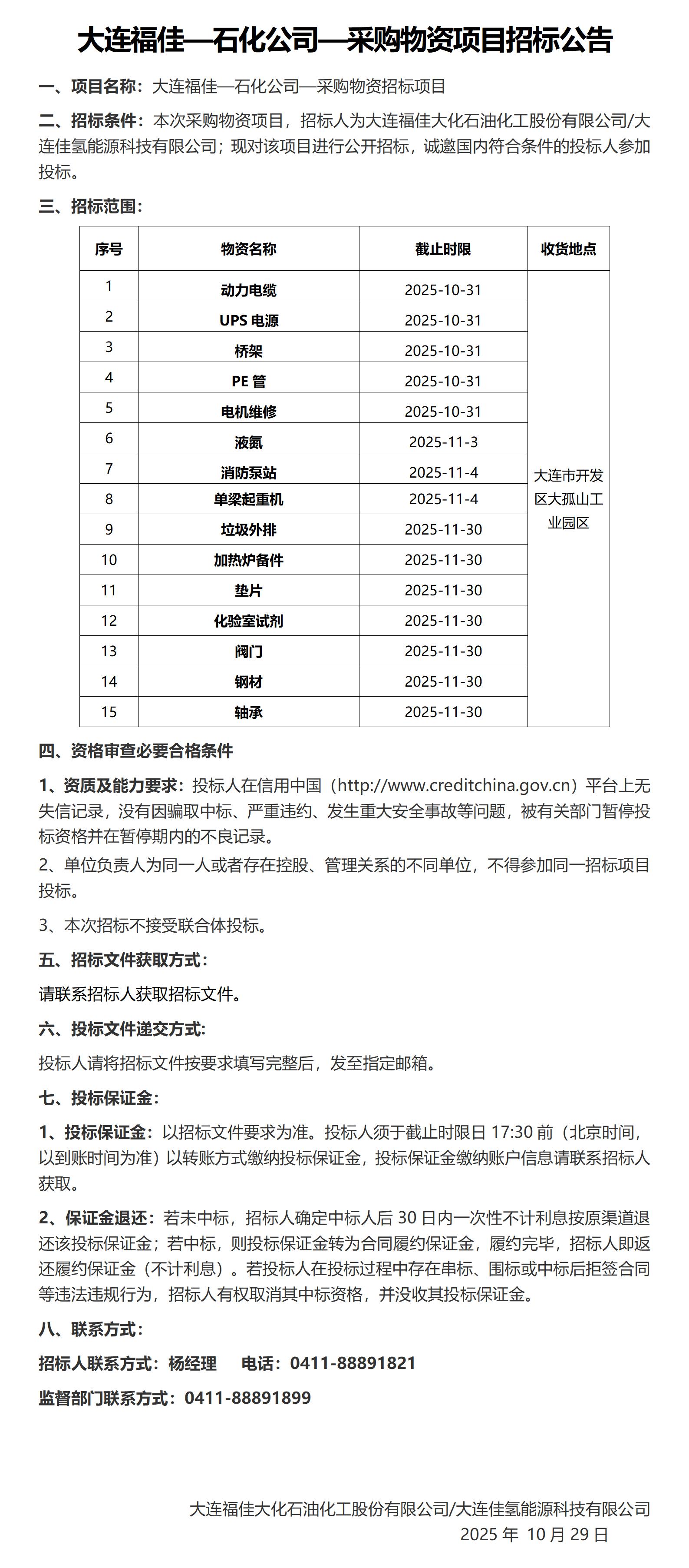 大連福佳大化石油化工股份有限公司—11月采購(gòu)物資項(xiàng)目招標(biāo)公告
